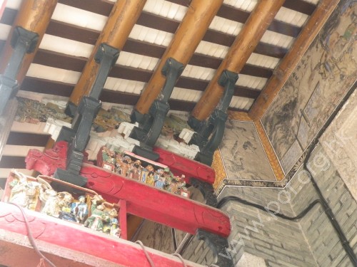 位於屏山塘坊村述卿書室前廳,遺落於民宅中,掩蓋書室昔日華麗的氣派。 | 前廳頂的壁畫、陶瓷裝飾、黑色木刻斗拱等,手功精細,可惜深藏民間。 |