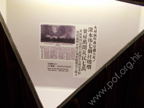 位於深水埗的石硤尾邨是香港最早興建的公共屋邨,其起源於1953年發生的大火災。石硤尾古稱「石甲尾」,位於深水埗東北地方。二次世界大戰後中國國內局勢動盪,大量難民逃到本地、以廢木和鐵皮等物料搭建寮屋棲身。當年深水埗的居民人口劇增,區內出現多個木屋區。1953年12月25日聖誕夜約9時30分,石硤尾寮屋區內一戶居民不慎打翻火水燈,引發火警,短時間內火勢蔓延至石硤尾六村木屋區。當年政府動員兩部滅火車從港島渡海支援,及動用百餘條水喉撲救。大火至凌晨才大致受到控制,但已造成40多人傷亡、超過5萬人無家可歸。大火翌日政府即時成立「石硤尾六村火災急賑委員會」,組織及統籌賑災工作。當年政府向災民派發熱飯、救濟金、白米及日用品,每天的支出達5萬元之鉅。而當時社會各界、商號、中國及外國政府等都有響應捐款救災,兩星期內已籌得15萬港元現金、大量白米、衣物和藥物等救災物資。