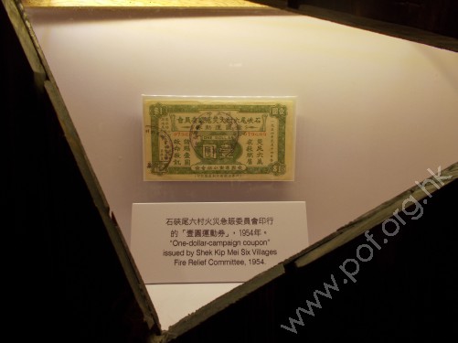 展出當年石硤尾六村火災急賑委員會發行的救災籌款「壹圓運動劵」。