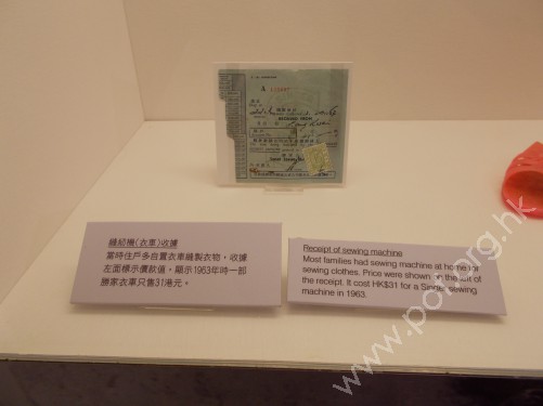 展出購買衣車收據,1963年一部勝家衣車只售31元,夠徙置大廈交三個月租了。