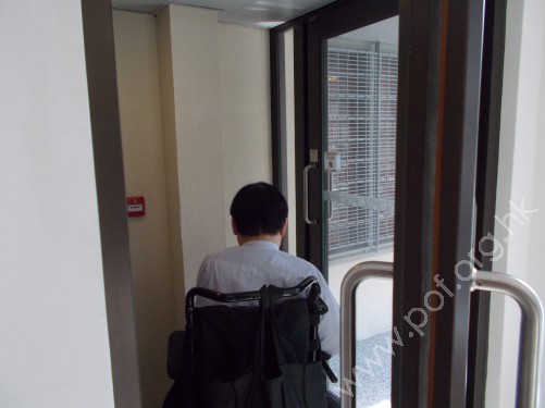 不過一樓升降機大堂往生活館要經過兩度防火門,直角排列無足夠空間予輪椅人士推門,需有人協助開門。