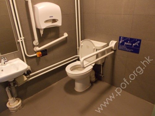 青年旅舍地面層設有公眾人士洗手間,暢通易達洗手間設施齊全,惟兩邊扶手高了,順道要求改善。