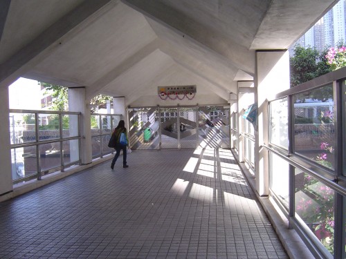 連接第一期及第三期住宅與商場行人天橋的玻璃門出入口 | 往來第一期及第三期住宅與商場的行人天橋,橫過鞍祿街。 |