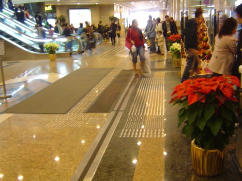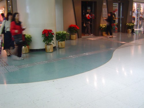 地面層6號及7號升降機其中一部門前有金屬觸覺引路徑 | 商場地面層的雲石地板走廊,地面上的觸覺引路徑,對應馬鞍山市中心巴士總站黃色觸覺引路徑。 |