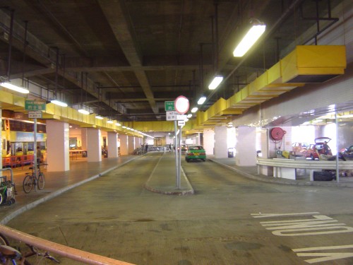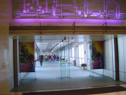 霓虹色彩的自動行人道,連接商場L2與L3層,七彩斑爛。 | 連接L2與L1層停車場的自動行人道,方便推物品到停車場。 |