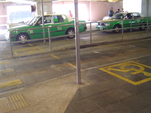 巴士總站內一旁的計程車站,分市區及新界兩條候車線。 | 新界計程車候車處,設有障殘人士候車位。 |