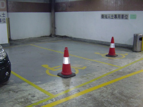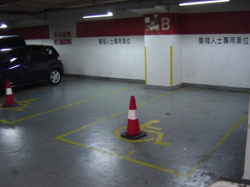 位於B區的障殘人士專用泊車位,一排兩個車位。 | 停車場B區的出入口,面前是斜道,有紅地毯。 |