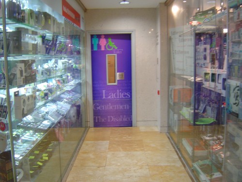為障殘人士而設的洗手間門與一般洗手間相同。 | 往來洗手間走廊的防煙門,也有一定的美工水準。 |