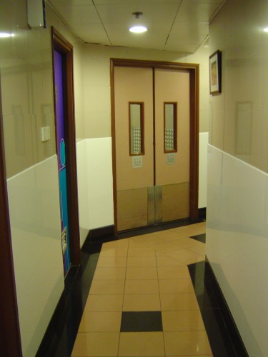 商場往來升降機的通道,防煙門上也有與新港城中心相同的美工圖案。 | 推開對開防煙門後是一條平坦走廊,走廊一端的木門後是升降機。 |