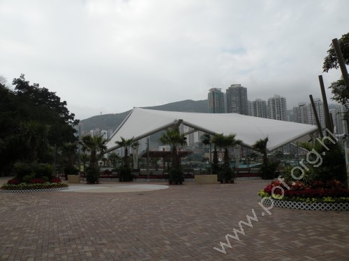 由天幕覆蓋的多用途表演場地,場地成圓形,面向水月宮。 | 站在高架觀景平台可瞭望公園內四處景色,觀景台下是漁業展覽廊。 |