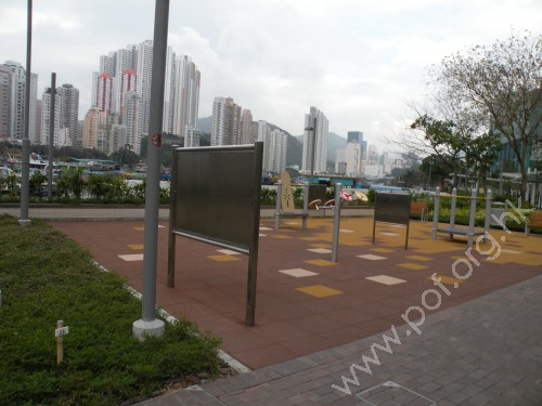 公園內設有的長者健身設施。 | 公園鄰近海濱長廊一邊設有的橫水渡碼頭,往來香港仔。 |