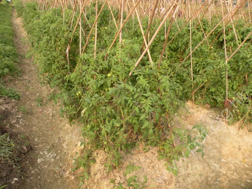 園內種植的有機蕃茄,未成熟時是青色的。 | 園內種植的向日葵,花球比手掌還要大。 |