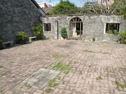 屋旁的練武場,現時雜草叢生,不知當年練武的場面如何? | 園內正廳的留耕堂,供奉長春園列位祖先神位。 |