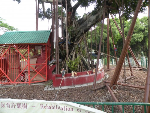 林村第三代的老榕樹許願樹,因長期受善信香火寶牒摧殘,要深切搶救。 | 搶救許願樹工程不小,要處理枯枝及蟲害,一大堆支撐圓柱用於保護樹幹。 |