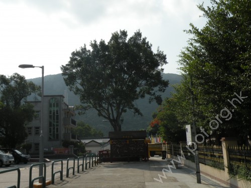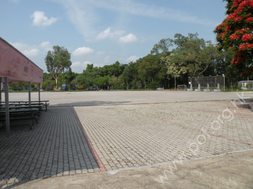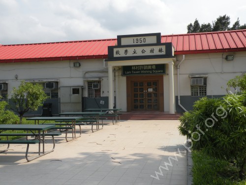 廣場內的一棵鳳凰木正開著鮮紅的花朵,但願這種大樹不會成為另一棵許願樹。 | 廣場內的林村公立學校現已荒廢,有建議改建為村校博物館,校舍旁成了許願廊。 |