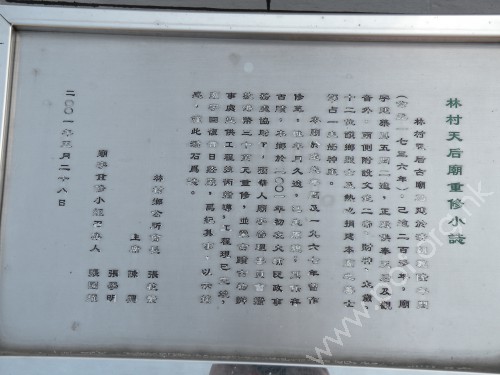 林村天后廟佈局是五間二進式,五間是五間房成橫排,二進是前後兩排。 | 天后廟前設有的告示牌,說明廟宇興建及重修年份,顯示廟宇歷史悠久。 |