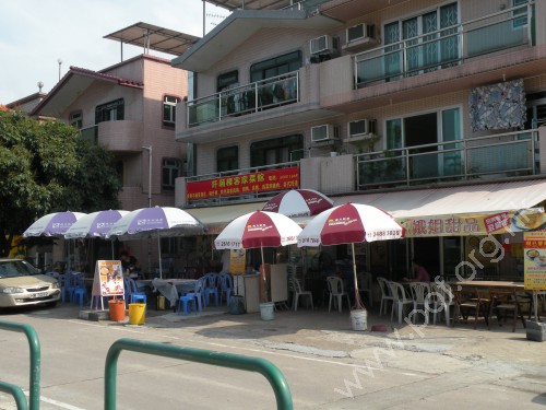 蘭花公廁內天井通道是平坦無障礙,到達傷殘人士洗手間。 | 村內食肆不多,但室外均設有有帳蓬的茶座,方便食客。 |