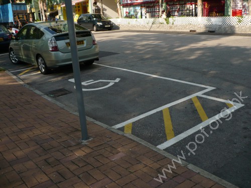 大埔舊墟天后廟前設有斜道方便輪椅使用者的善信到廟前參拜。 | 舊墟的翠樂街設有兩個這樣的供傷殘人士使用的路邊泊車位。 |