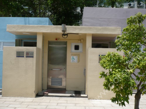 博物館內辦事處旁設有供傷殘人士使用的洗手間,往來洗手間的路面也是平坦的。 | 位於舊墟範圍的汀太路兒童遊樂場內大埔舊墟公廁,提供傷殘人士使用的洗手間。 |