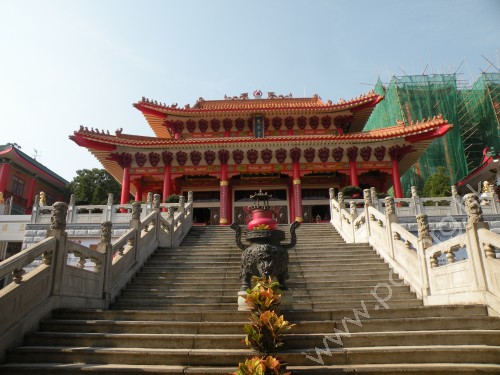 仙館正中大殿「三聖大殿」,又名「兜率宮」,供奉全真龍門派三位祖師。 | 三聖大殿建築宏偉,以紅色為主色,兩層的方型塔式瓦頂,旺板有大量金龍裝飾。 |