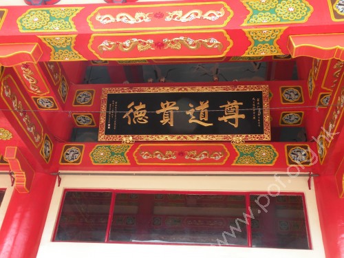 兜率宮正殿頂的牌匾「尊道貴德」,彰顯「道」和「德」的核心信仰。 | 正殿前的道臺,鮮紅色加上鑲金花草雕飾,極盡華麗之能事。 |