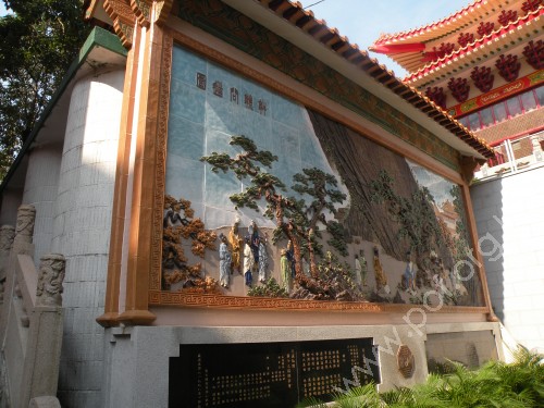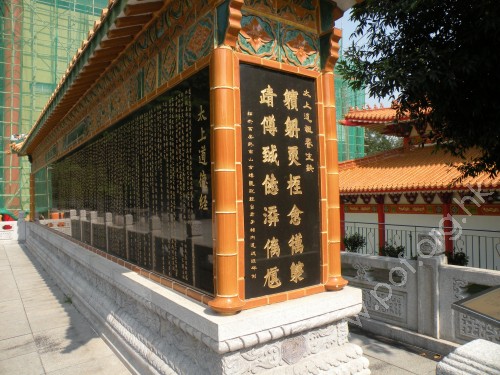 正殿旁的蓬萊閣亭樓,綠瓦紅柱的設計,華麗之餘又是一個靜思的好地方。 | 仙館內的遊覽設施「道德經壁」,採用蒙古特產黑金剛石刻上道德經全文。 |