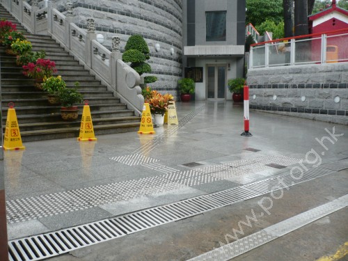 仙館正門牌坊一入內地上就舖有觸覺引路徑,好比仙人指路。 | 正門設有的升降機樓,直達仙館平台,到坤堂或喜雨樓均很方便。 |