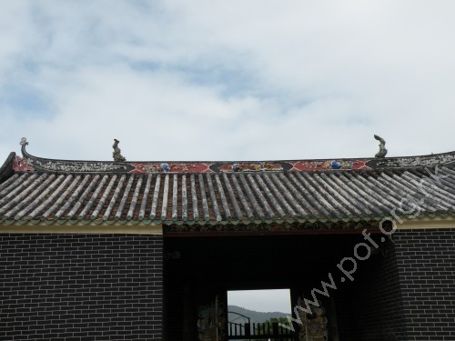 整個封檐板刻滿吉祥圖案包括人物動物花卉等,均是喻意保佑後人長壽富貴。 | 前廳屋脊上兩邊的鰲魚雕飾,寓意後人科舉高中,「獨佔鰲頭」。 |