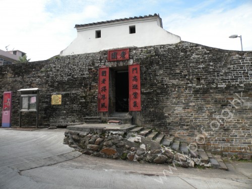 覲龍圍的門樓,紅色字門額上有乾隆甲子歲字樣,顯示圍牆建立年份。 | 圍牆及四角更樓現已列為法定古蹟,看城牆的規模何其宏偉壯觀。 |