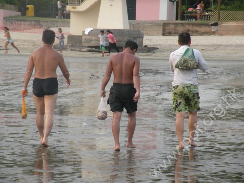 海水退潮無阻遊人暢泳,還可以順道掘海產為樂。 | 貝澳海產豐富,一於全家擔凳仔,摸蜆仔。 |