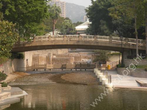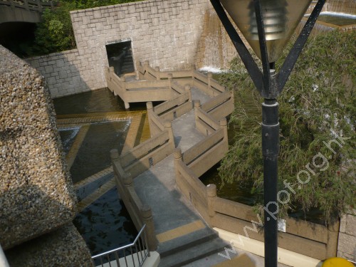 公園中央設有人工瀑布,規模不小,可惜過於工整缺乏自然美。 | 瀑布底建有的石橋,曲徑設計,為工整的瀑布添點雅緻趣味。 |
