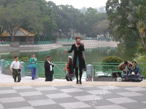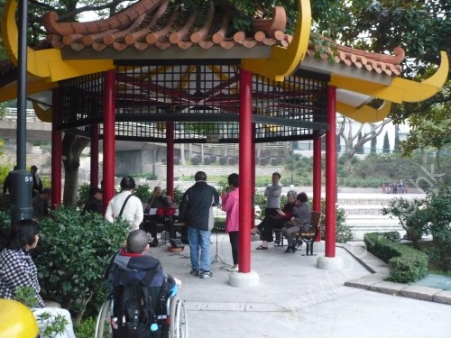 自娛區不夠用,公園任何一角均可成為舞台,好像這個湖畔場地夠大夠闊絡。 | 那邊湖畔一個涼亭被用作粵曲戲台,亭台古樂,琴音渺渺,發思古之幽情。 |