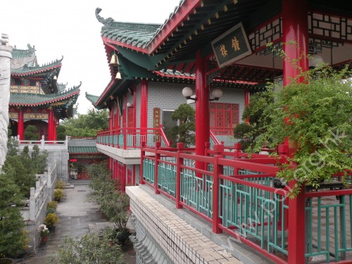 藏經閣對面兩層建築物是文物閣和西齋,青磚紅柱,簡潔中顯出喜氣。 | 文物閣前是鼓樓,與對面的鐘樓互相呼應,鐘鼓齊鳴,恭迎神明入座。 |