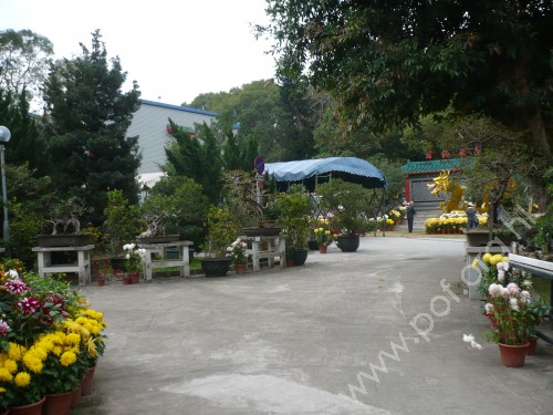 門樓橫額上「雲泉仙館」四字是前新界鄉議局主席陳日新太平紳士所題。 | 穿過門樓,小徑兩邊是別緻的盆景、綠化的園藝與菊花,使人眼前一亮。 |