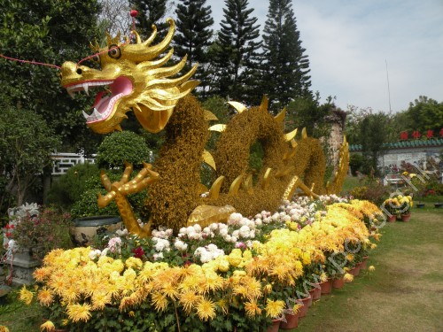 道德廣場一角的「莊子臺」,尤如莊子般隱世脫俗,不知可有蝶夢。 | 道德廣場的金龍及銀龍園藝,金龍配襯在菊海上比騰雲駕霧更逍遙。 |