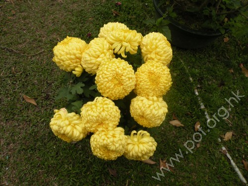 池塘有座假山,假山上有亭樓雕塑點綴,小小的一個正是「亭外有亭」。 | 仙館以菊花展馳名,館內園林區都置有菊花盆栽,如這盆黃菊多茂盛。 |