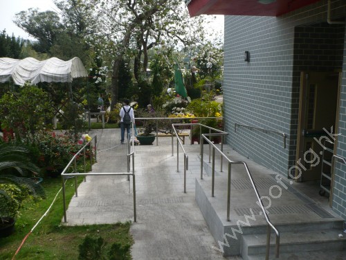 墨莊辦事處正門前有梯級,側門連接斜道,前方是獨立的傷殘人士洗手間。 | 玉泉軒是供訪客享用齋菜的膳堂,側門設有斜道連接,大開方便之門。 |