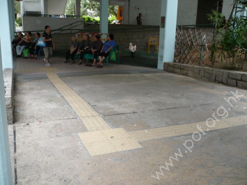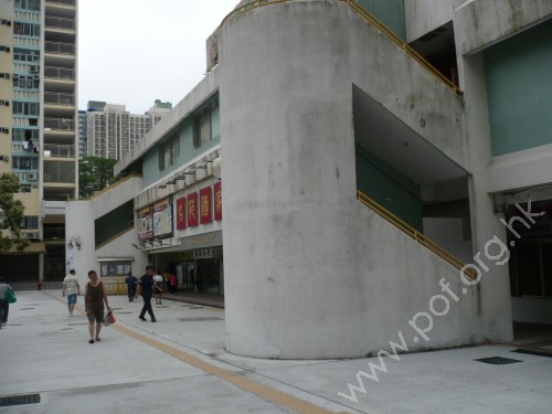 連接汽往來車路旁屋邨行人路的商場前行人路,通道是寬闊平坦無障礙的商場內地面有蓋行人路,一端轉角連接面向社區會堂的商場行人路,另一端轉角連接面向住宅的商場行人路,商場是方形設計,地面行人路是開放式四通八達,行人路緣設有黃色引路徑沿屋邨行人路伸延及分支,商場內行人路無觸覺引路徑.
