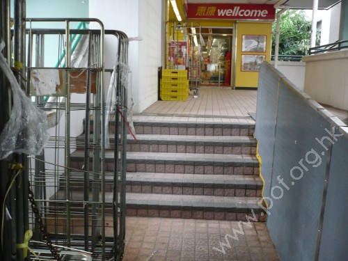 連接商場地面行人路,通道是寬闊的梯級,往來商場2樓層酒家,無設升降設施,無觸覺引路徑.