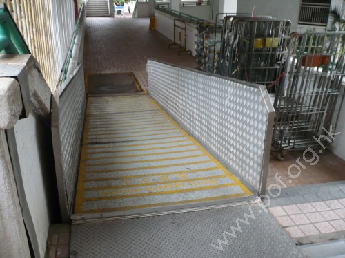 連接往來泰德樓與商場2樓行人天橋高低位置,斜道是寬闊的貨運斜道,與梯級並排,斜度頗大,頂底兩頂無觸覺警告帶,兩邊無扶手及牆壁.
