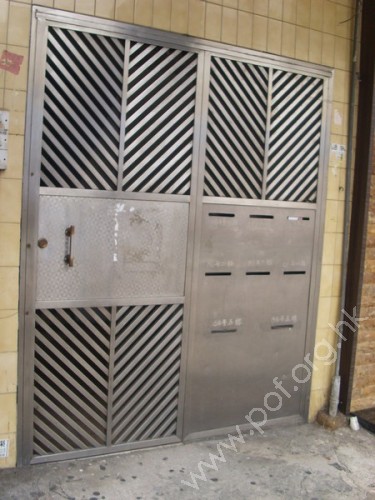 通道約1米,大廈入口設有一扇不銹鋼閘門,門內是梯級,没有觸覺引路帶。