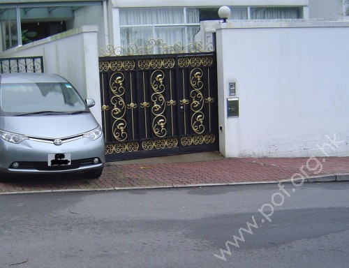 連接汽車路與旁行人路,通道是寬闊平坦無障礙的屋苑出入口及汽車出入口閘門,往來屋苑住宅,前臨下斜路緣連接汽車路,兩旁行人路無觸覺引路徑,閘門是黑色金屬鑲金飾花紋閘門.