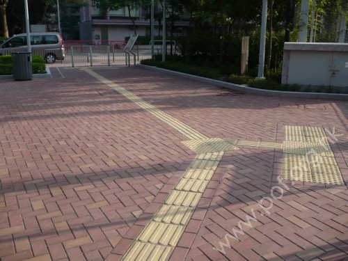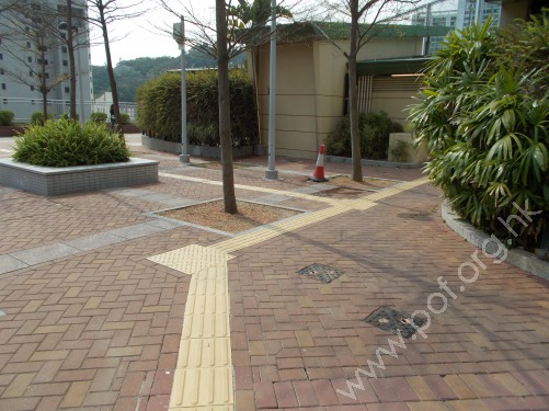 通道是寬闊平坦無障礙的公園出入口,進入後設有黃色觸覺引路帶,沿公園內行人路伸延及分支;經本會投訴跟進後,出入口原有的平面地圖改為觸覺點字及凸字地圖。