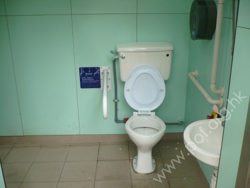 廁所是無分性別,門設有暢通易達標誌及點字資料;經本會投訴跟進後,更換爲較闊的不銹鋼面單邊推門;門內外設有扶手,直徑適中、高0.75米;面積1.5乘以2.2米;座廁高0.4米,沖水掣高1米;洗手盆高0.7米,水龍頭是槓桿式控制;設有L扶手,摺合扶手高0.75米,有使用說明;緊急叫喚鐘顯示器位於門外門頂上方,按掣高0.68米。