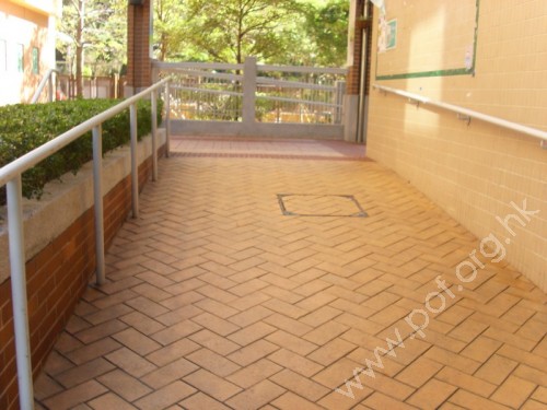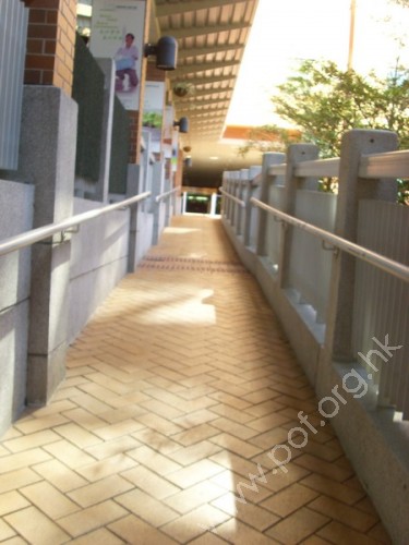 斜道寬闊,長,中間有平面,角度適中,兩旁有扶手,底頂及平面有觸覺警告帶。