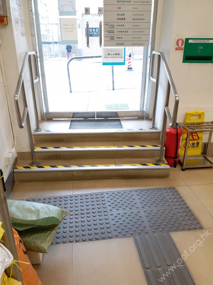通道闊度足1.05米,出入口前設有1級梯級,出入口設有兩扇玻璃推門,門內有3級向下的梯級,門內梯級兩旁設有欄杆式扶手,無觸覺引路帶。經本會投訴跟進後,於2018年03月初郵局門口增設召喚鐘使用說明、輪椅標誌和告示牌,輪椅使用者在有需要進入郵局辦理業務時,可按鐘向職員求助。