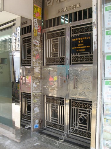 通道寬闊,門口有一級梯級及設有兩扇不銹鋼閘,無觸覺引路帶。