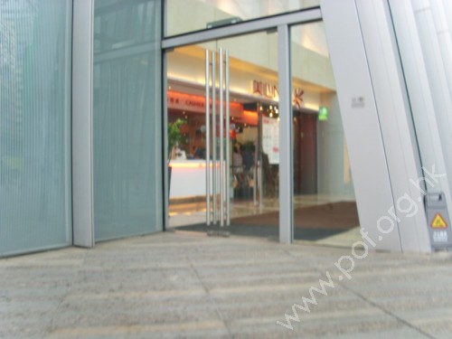 通道寬闊,平坦,入口設有兩扇對開玻璃推門,無觸覺引路帶。