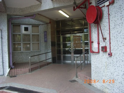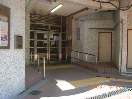 通道寬闊微斜無障礙,設有向外拉的玻璃門,兩旁設有扶手,鋪有黃色的觸覺引路帶導引至門口.