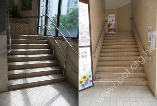 通道是梯級,底部連接兩級平台及地面層行人路,至1樓需穿過一道對開門便能前往教會;地面層的兩級平台寬闊,平台豎板高160毫米,梯級闊1.6米,共有3段,兩邊有扶手,無觸覺引路設施。